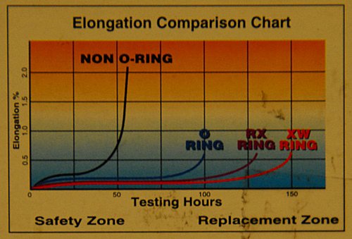 上圖是不同形狀的油封對鍊條所產生阻力及其使用壽命時數示意圖(取自RK練條盒上的說明)